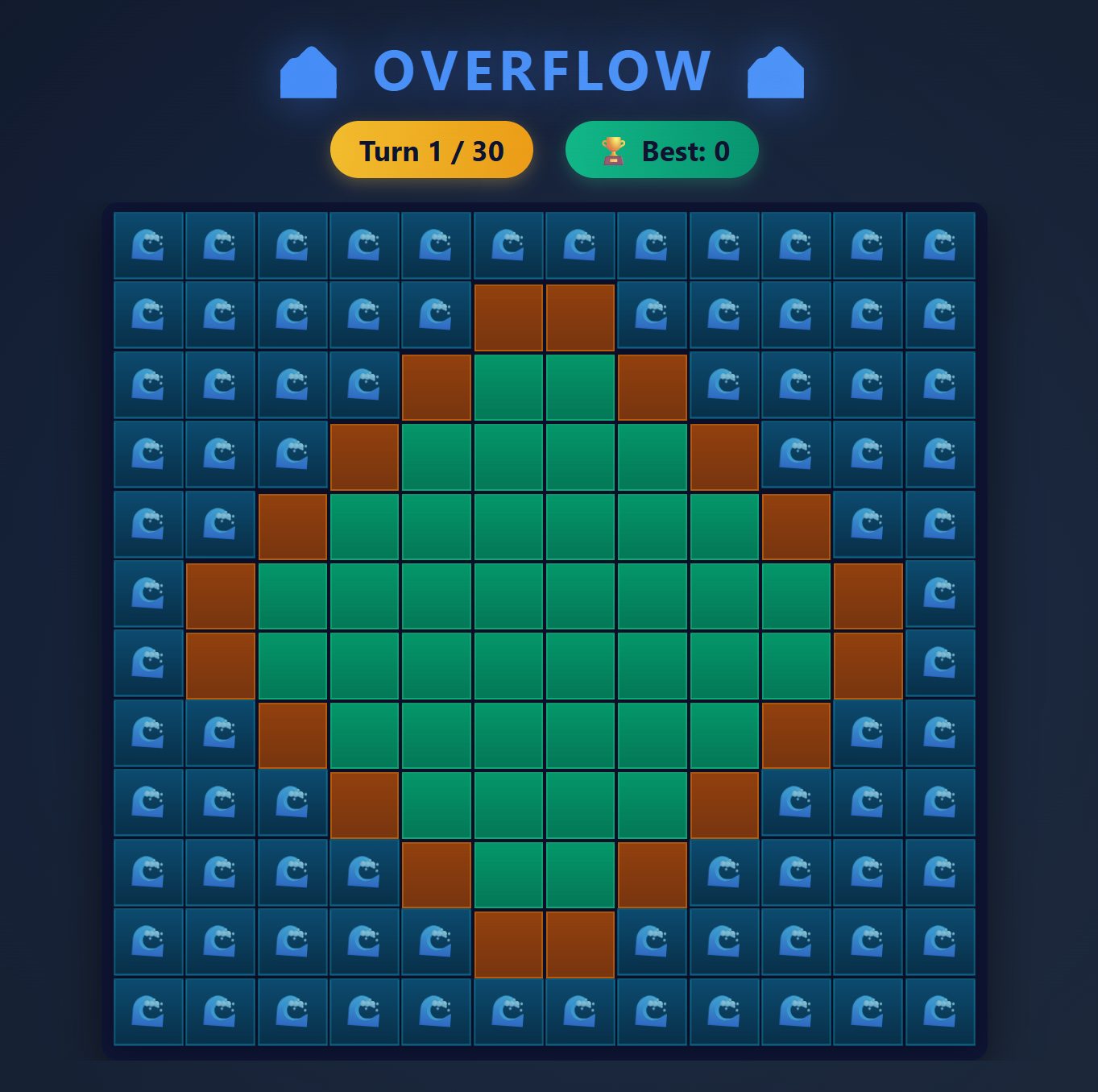 🌊 Water rises every 5 turns from edges inward - Walls protect adjacent tiles for 1-2 waves!